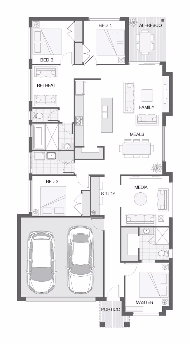 As you move through this thoughtfully designed space, you’ll find a harmonious open plan living, dining, and kitchen area at the heart of the home. This central space fosters a sense of togetherness, making it the perfect spot for family gatherings and entertaining. The Astrid enjoys a little bit of extra luxury with a separate media room and an additional lounge retreat.