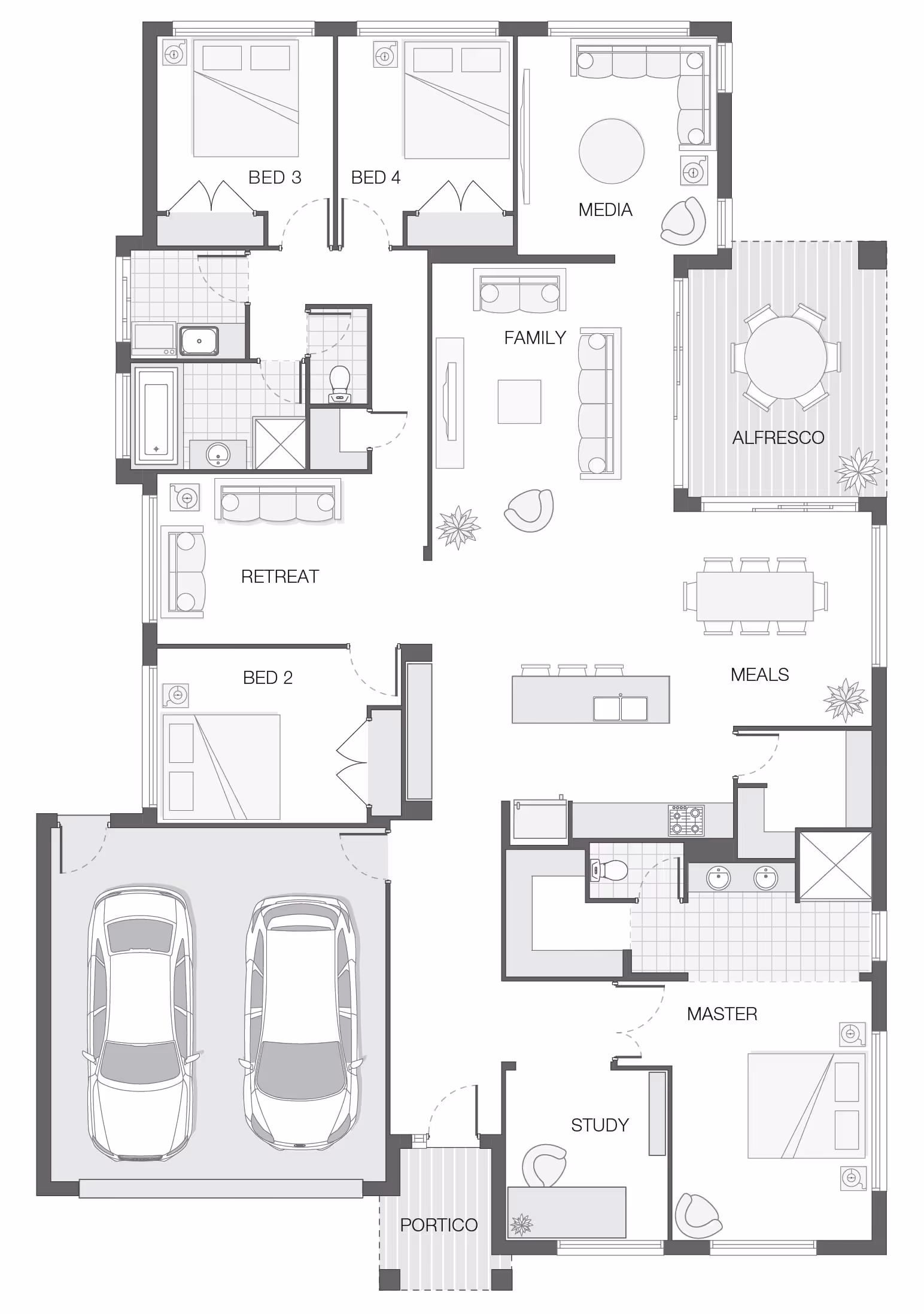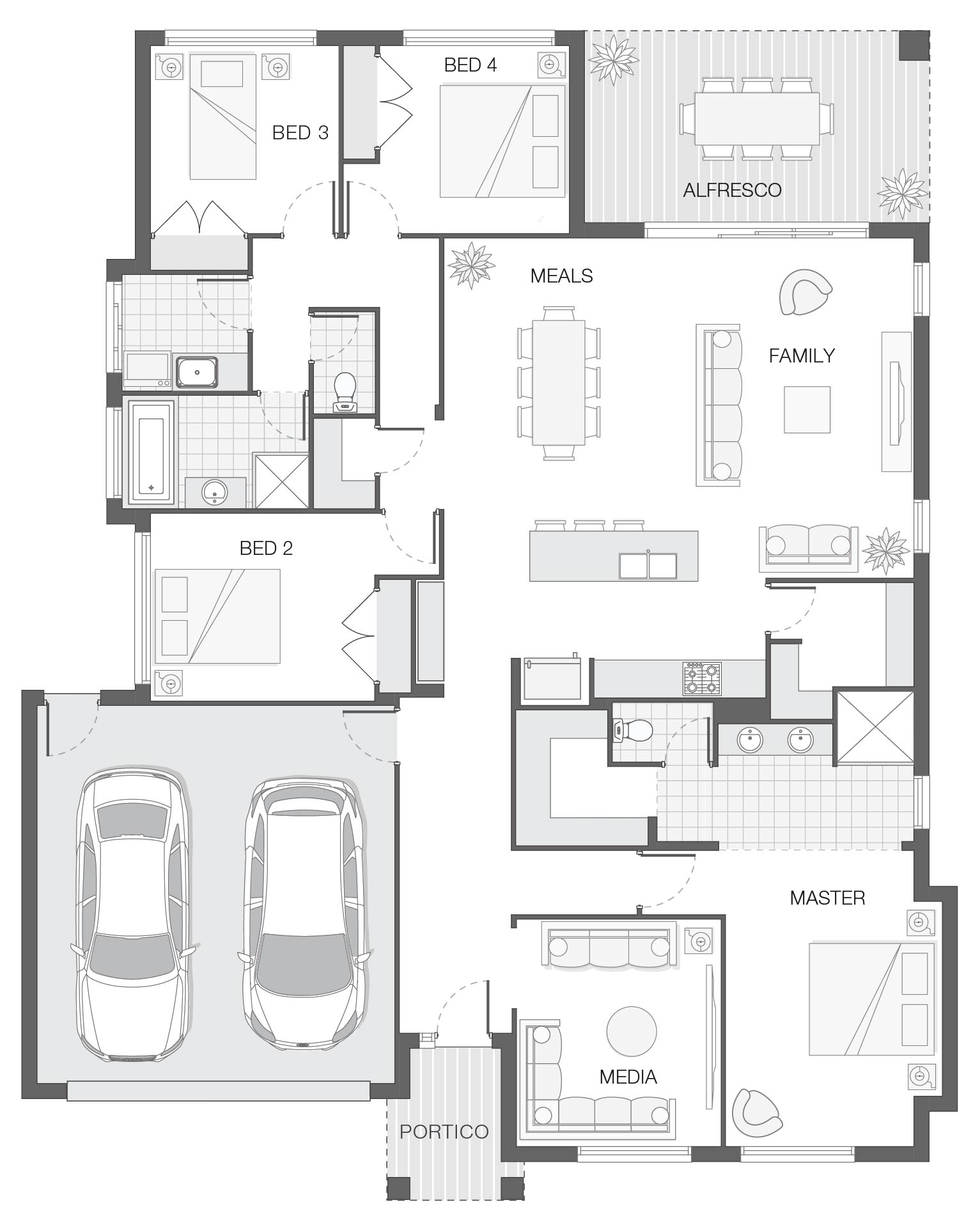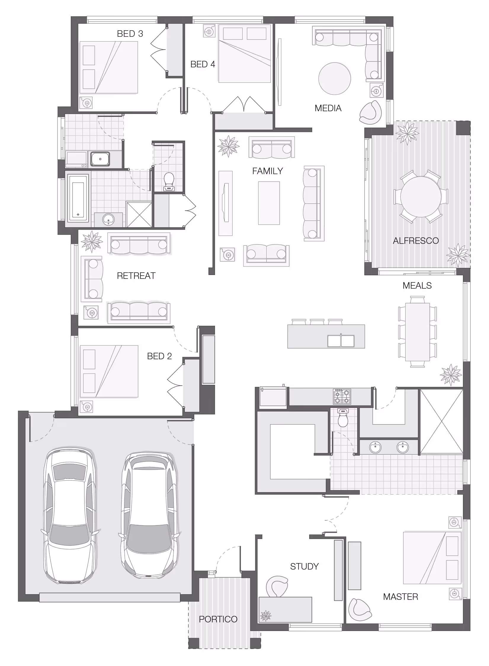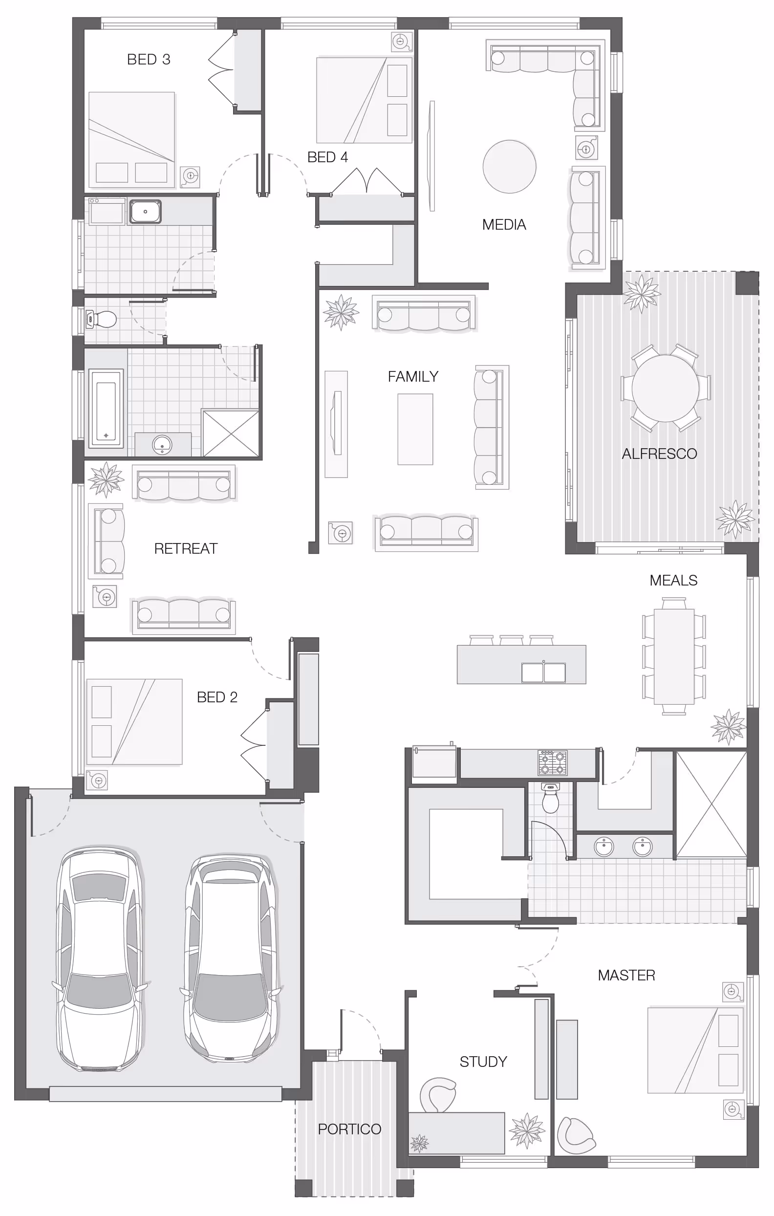 The Baywood home design centres around a welcoming and hospitable heart of the home where the kitchen, dining, and al fresco area coalesce harmoniously to create an ideal space for socialising, leisure, and unwinding.