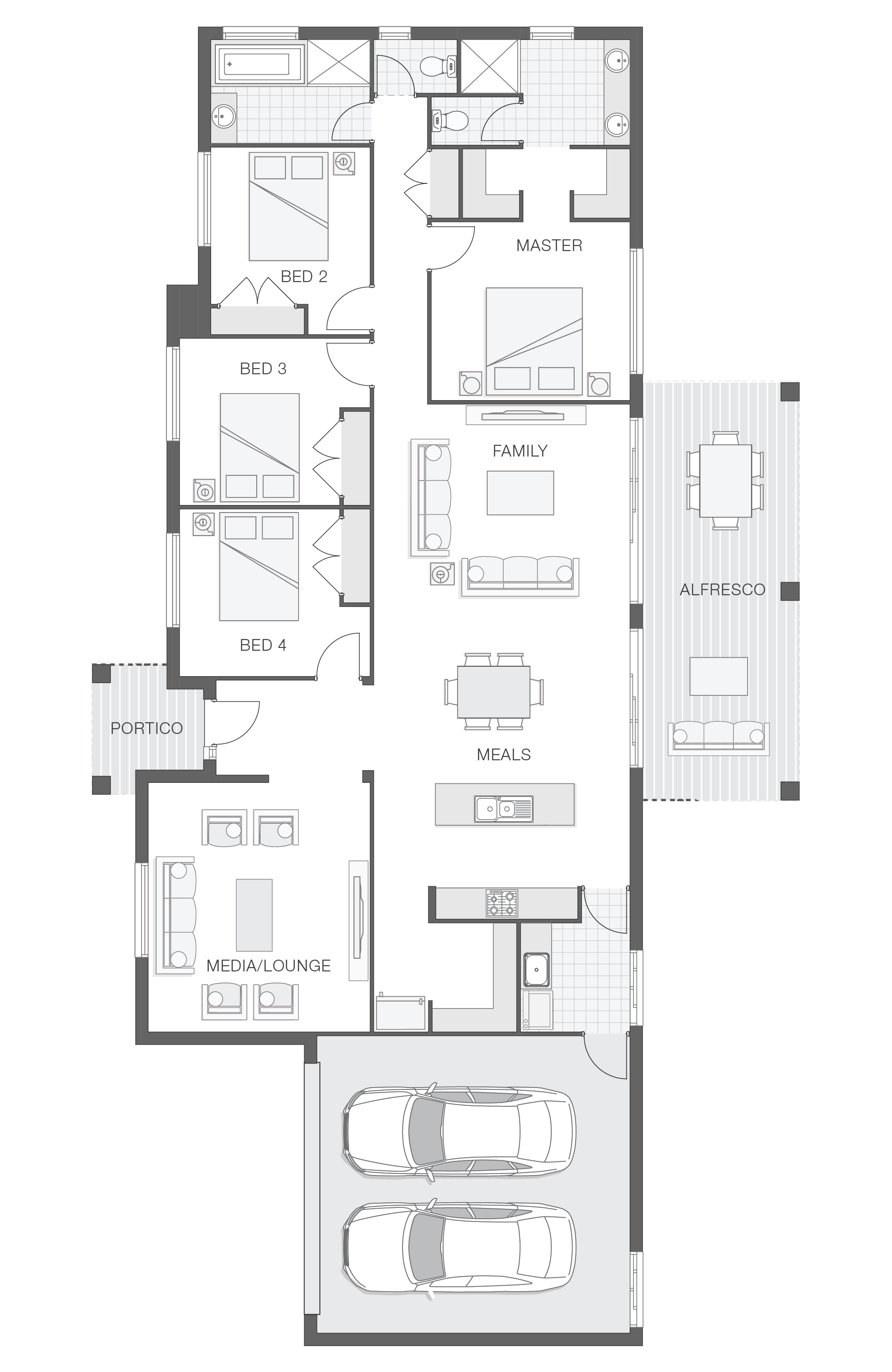 The Bellevue home design exemplifies luxury acreage style living in a well-appointed and lavish single storey design. Intended to create a lasting impression, the Bellevue ticks all the boxes both inside and out, with a large alfresco entertaining area, galley style kitchen and generous walk-in pantry entertaining is easy. While the internal living space including bedrooms and media lounge is spacious, well-separated for privacy and functional for the entire family.