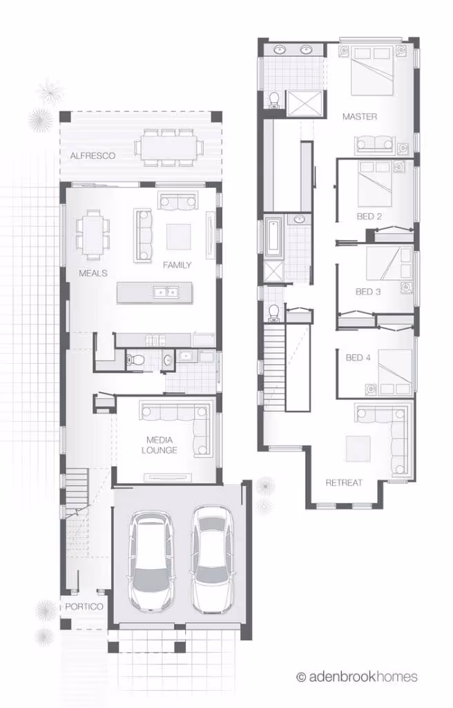 The Boston home design is a sleek and stylish double storey home that is designed to fit on a small lot without compromising on spacious family living. The lower level comprises living space in the form of media room and open plan kitchen, living and dining space accompanied by the alfresco area that spans the width of the home. The upper floor has a generous master retreat and three additional bedrooms that share a private retreat area. With space and privacy the Boston is the perfect family home for a small lot.
