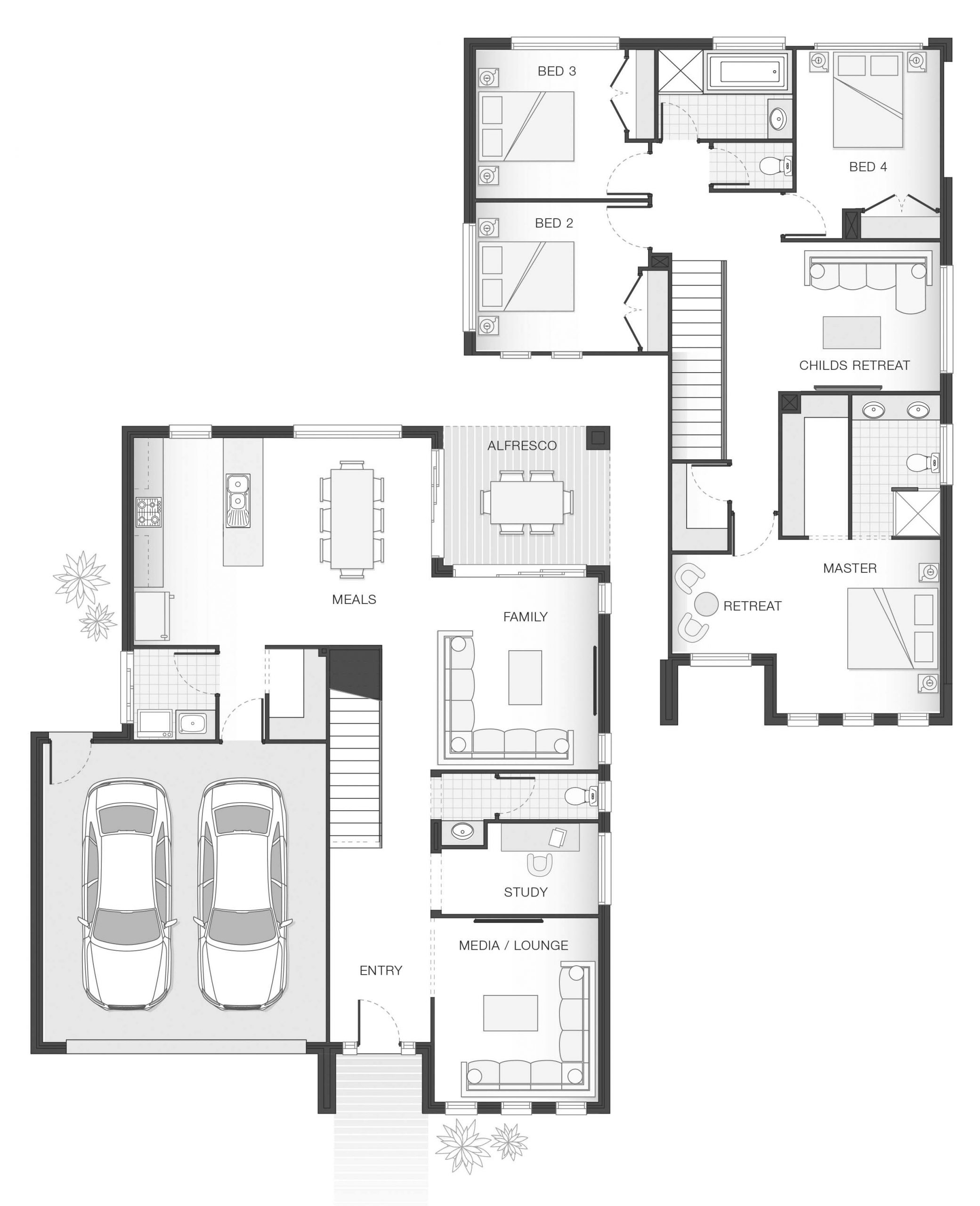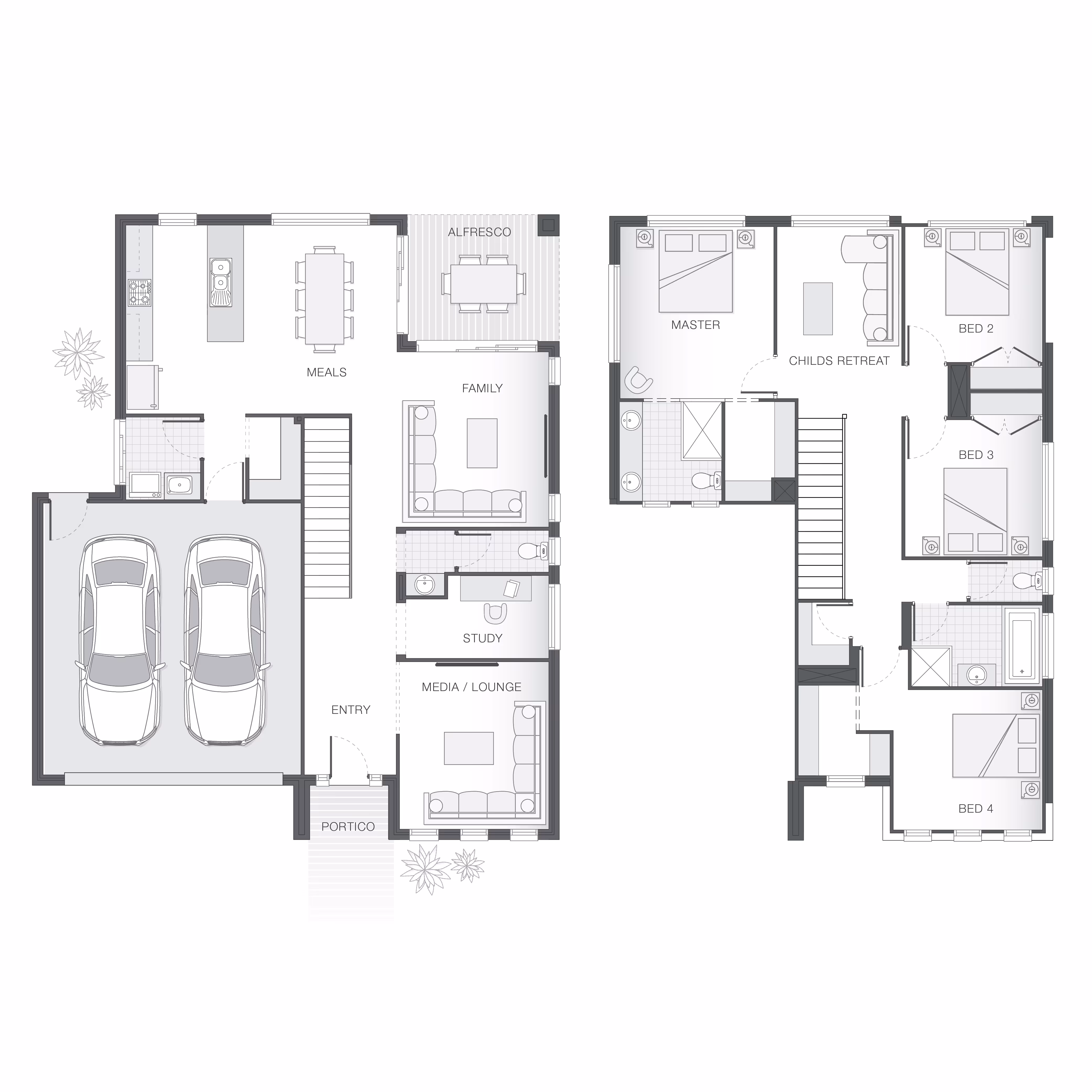 The Capestone home design is the perfect balance between entertaining and relaxation. The lower level offers multiple entertainment zones including an alfresco and indoor dining area and a separate media room. The upper level features the master retreat with ensuite and walk-in-robe creating a private sanctuary away from the main living area of the home. Also on the upper floor are the other bedrooms and children’s retreat, ensuring there is room for the entire family.