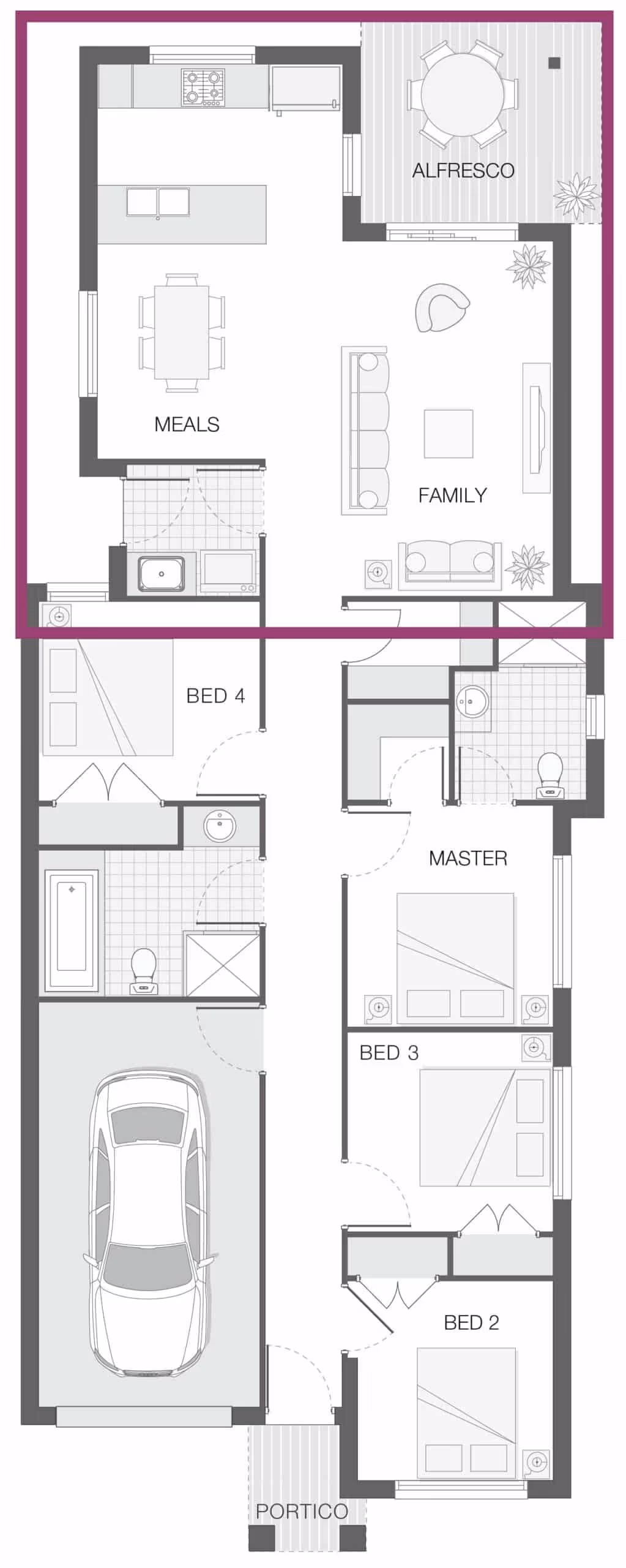 The Lara is a sleek 3 or 4 bedroom home designed specifically to maximise a narrow lot, with an emphasis on open plan living connecting seamlessly with the alfresco and outdoor living.