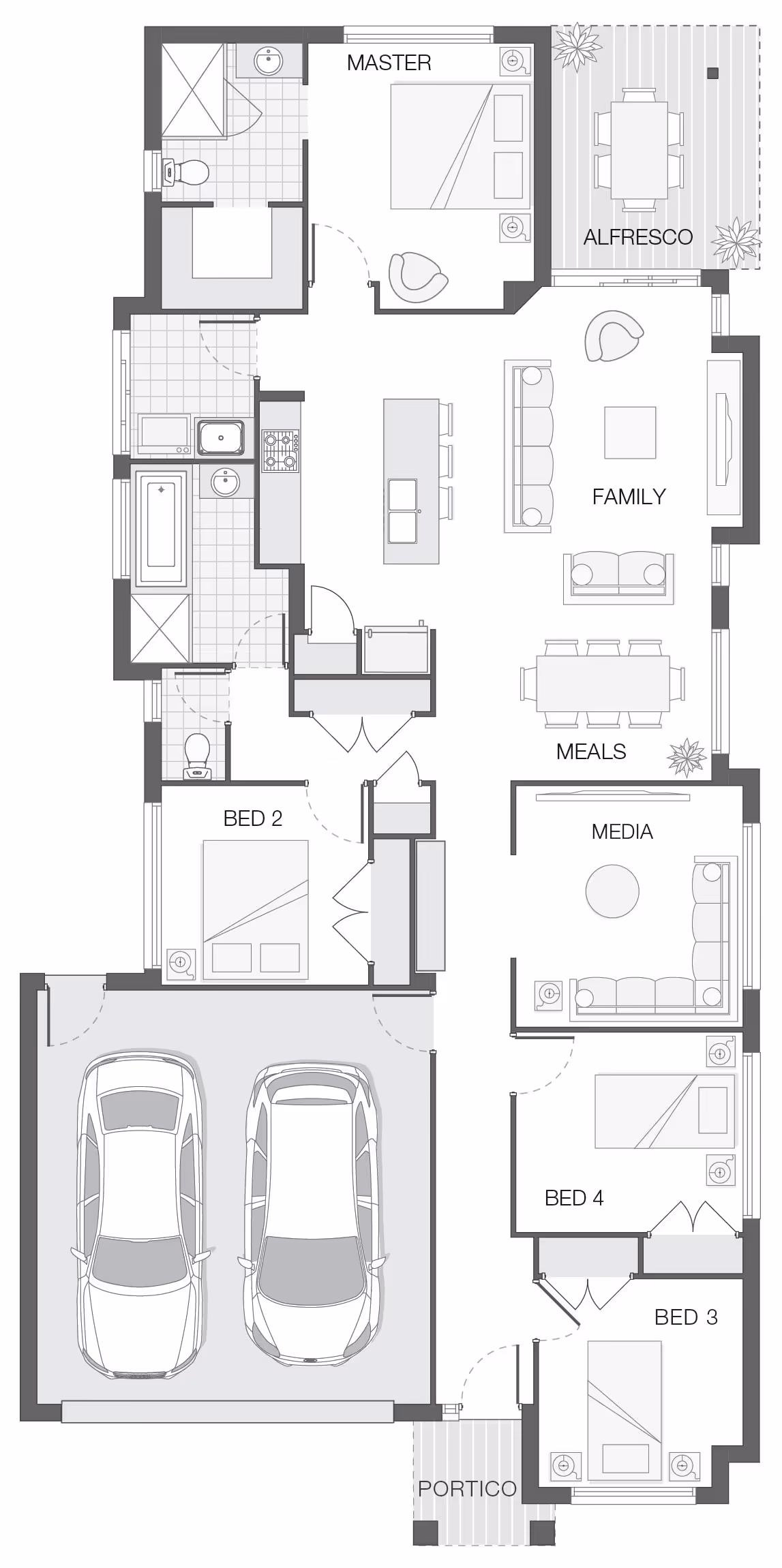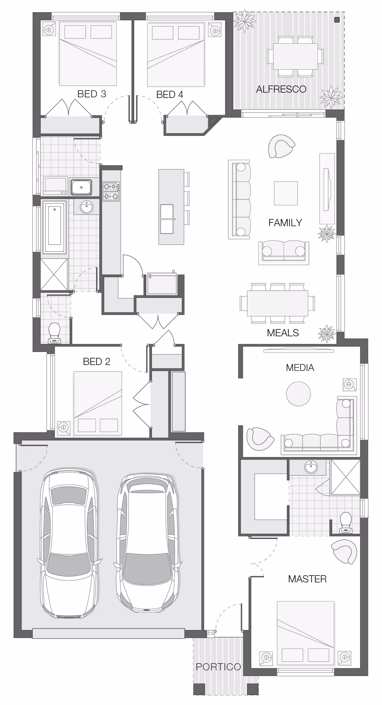 The Saxon home design is a harmonious blend of practicality and style, offering a layout that is ideal for modern family living, relaxation, and entertainment. This home is a celebration of the outdoors, where you will find yourself fully immersed in nature. Whether you are entertaining guests in the wrap-around alfresco area that seamlessly flows into the open plan living space, or simply relaxing in the family retreat that overlooks the tranquil outdoor courtyard area, you will feel at one with the environment.